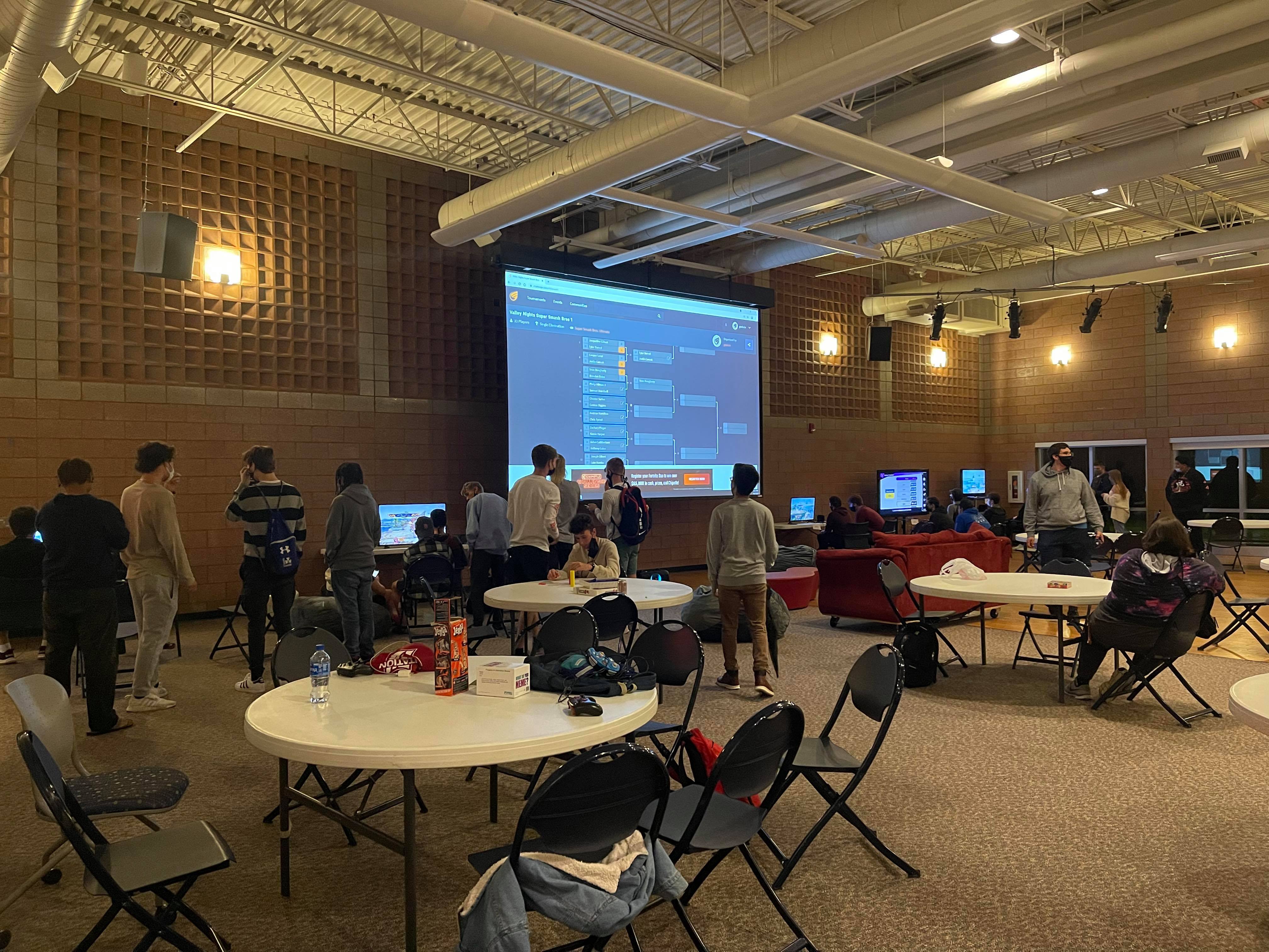 One-on-one competitions were held on various Nintendo Switch consoles broadcast to larger screens set up around the room. A bracket system was used to record winners and determine who qualified for the next round.